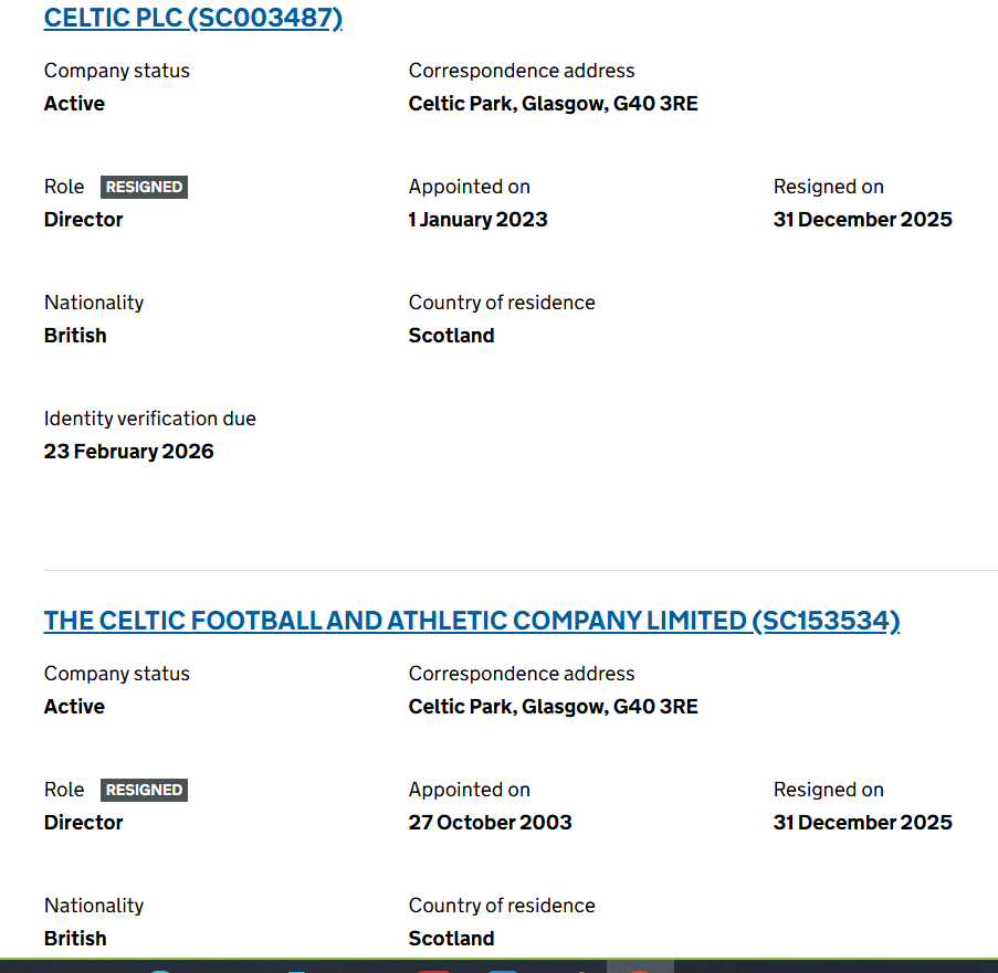 Peter Lawwell has now resigned from both Celtic PLC and Celtic Football and Athletic Company.